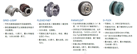 DODGE公司的PARA-FLEX輪胎式彈性聯軸器特有的內襯編織層增強的彈性體結構,采用法蘭組件安裝固定,可以傳遞更大的扭矩。PARA-FLEX系列包括直軸式、錐套式、隔套式以及高速飛速飛輪式等類型。
